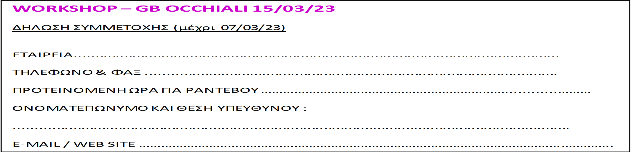 H εταιρεία αναζητά συνεργάτες στην ελληνική αγορά (αλυσίδες καταστημάτων , μεμονωμένα καταστήματα οπτικών,εμπόρους και εισαγωγείς ) και για τον σκοπό αυτό θα πραγματοποιήσει επιχειρηματικές συναντήσεις και θα παρουσιάσει τα προϊόντα της στην έδρα του Επιμελητηρίου ( Σόλωνος 102 – Αθήνα) την Τεταρτη 15 Μαρτίου , από τις 09.30 έως τις 16.30